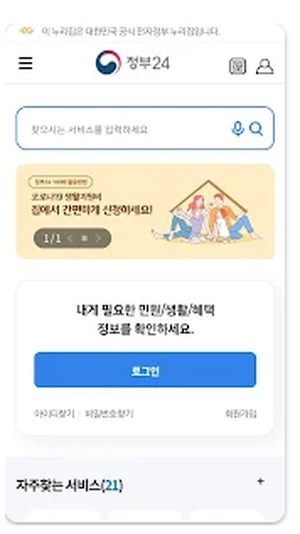 정부24는 정부의 서비스, 민원, 보조금24, 정책·정보를 통합 제공하는 대한민국 정부 대표포털 입니다.